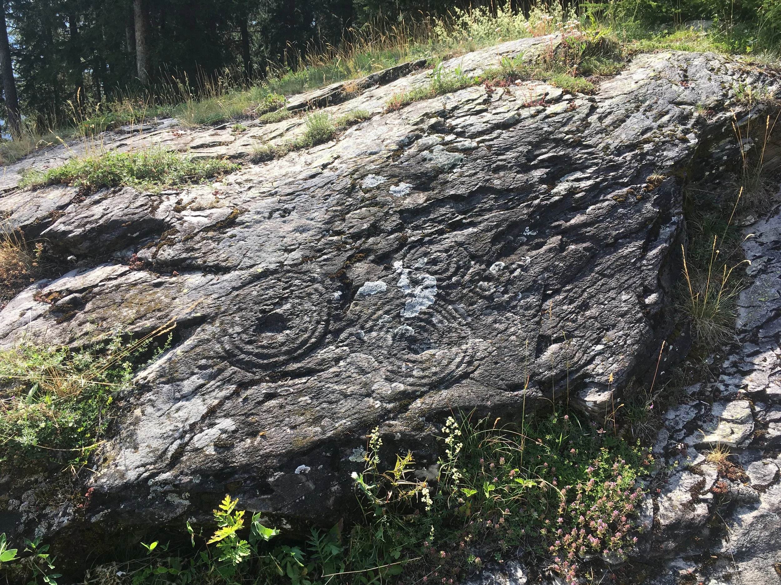 Am uralten Kraftplatz Senslas mit prähistorischen Steinzeichnungen verbinden wir uns mit Rätia, der Urmutter Graubündens und mit der Berggöttin Toissa, der Ahnfrau aus dem Surses.